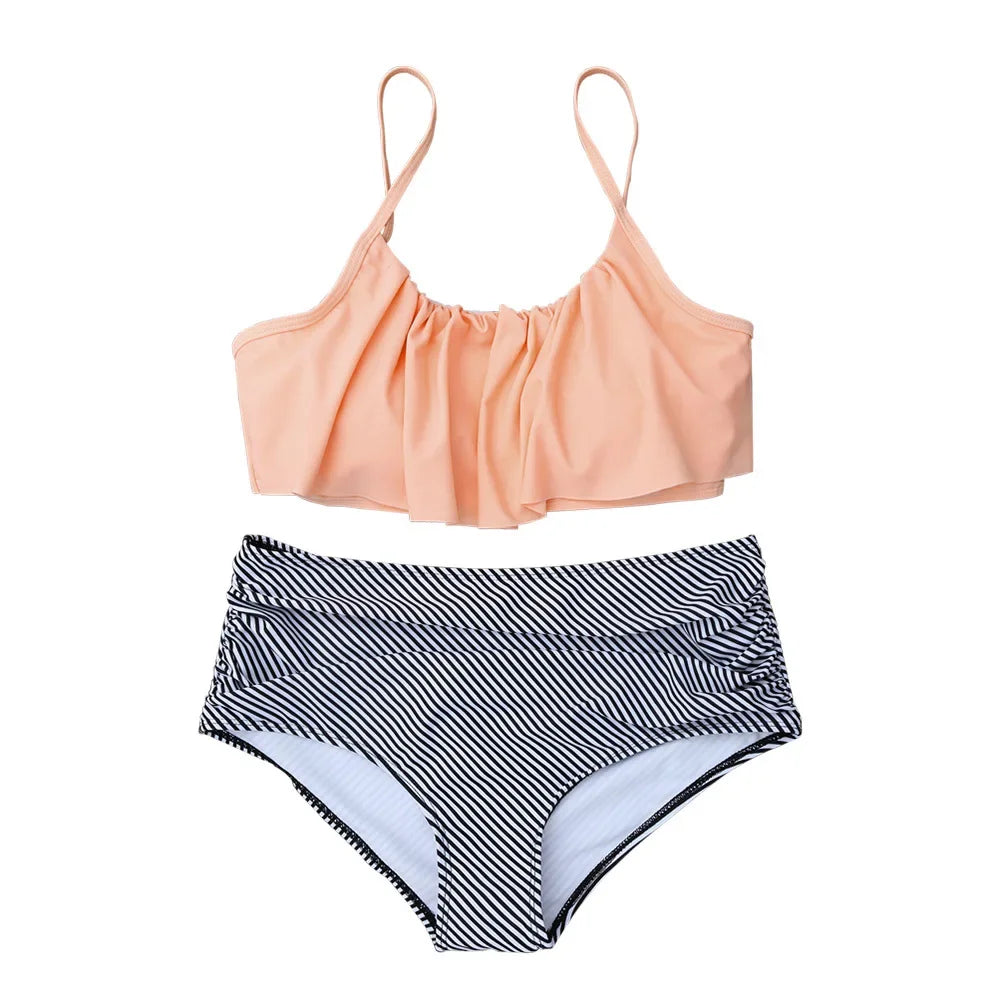 "High-Waist Bikini Set | Pink & Striped Two-Piece Swimwear"